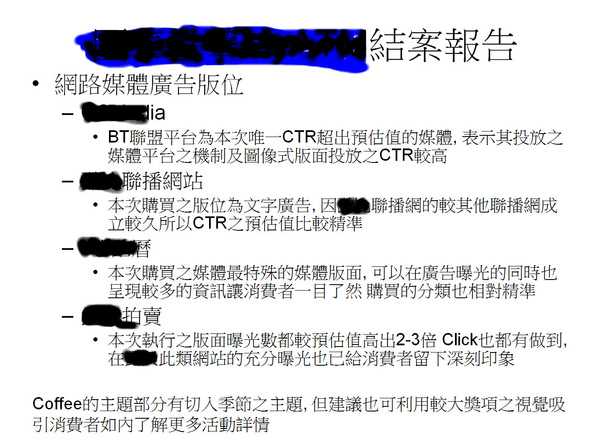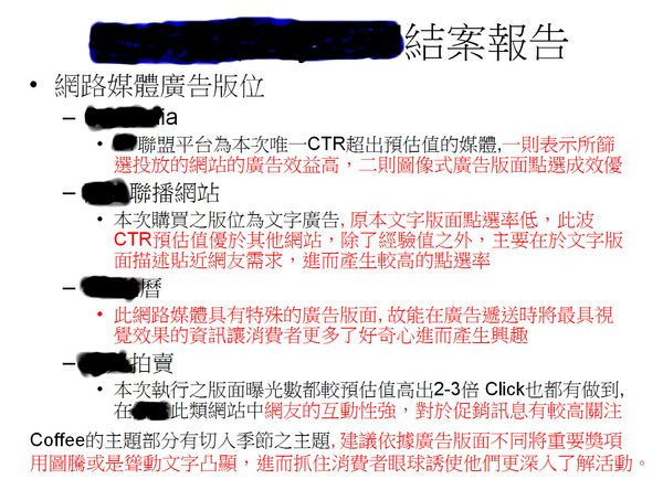 - 1.這個結案的結論是針對該波使用的各種聯播網站作分析,提供廣告主了解各個聯播網的優勢與效益。寫法卻非常拙劣,沒有任何數據來佐證這些網站的差異點在哪?