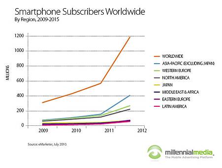 智慧型手機用戶數依據eMarketer調查資料,在2009年全球智慧型手機用戶約有3億1千2百萬人,到今年2011年底將會到達5億7千1百萬人。