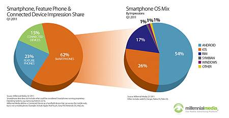2011年Q1 (全球)行動媒介的市佔量與智慧型手機平台的市佔量